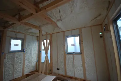 この発泡ウレタン断熱は通常のグラスウールなどといった壁内に埋め込む断熱材とは異なり、対象物に吹きかけると瞬時に反応し、100倍に発泡!