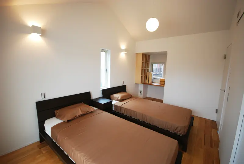 2階の主寝室には、シングルベッドを2つと間にサイドテーブルも!