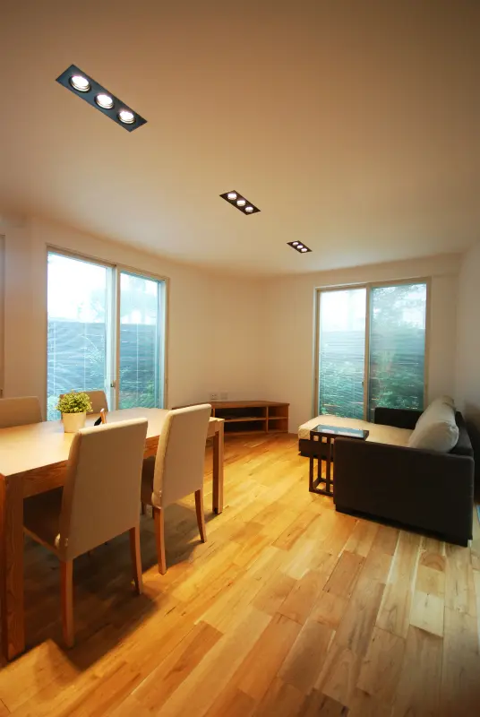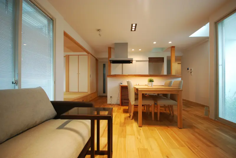 無垢フローリングに合わせ、コーディネーターの成嶋が選んだ柔らかな色合いの家具…いかがでしょうか?