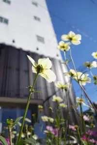 そんな寒空の下、セイズビル前ではコスモスなどのお花が頑張って街ゆく人を癒しています!
