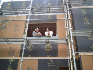 現場まで行った設計の田村氏が馬場大工と雑談中~