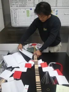 1/23(月) 上棟式前夜、雪に不安を抱きながら現場監督 木原が幣串を作成中。