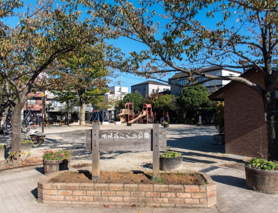 →ターザンロープや砂場、健康器具などがある、南篠崎エリアでは比較的広めの公園。春には桜が美しく咲くため、「さくら公園」という名前が付けられています。