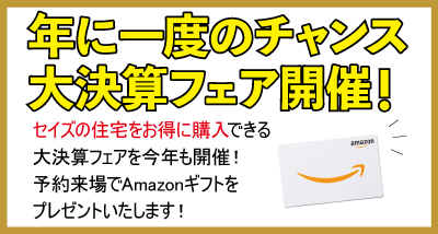 期間中の物件見学予約でAmazonギフト券をプレゼント。さらに対象物件のご成約で、追加のAmazonギフト券のほか、「物件価格お値引き」or「総額250万円相当の蓄電池プレゼント(設置費込み)」などお得な特典をご用意しています。