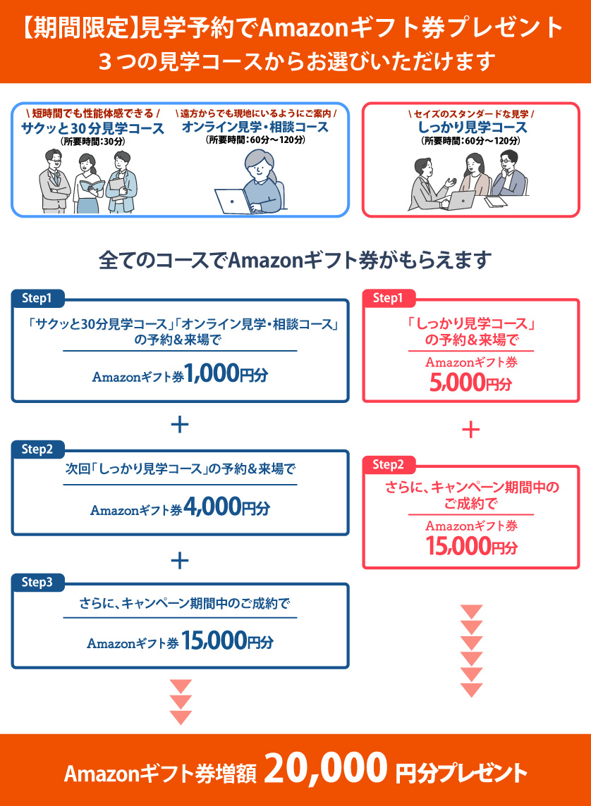 東京都からも性能を認められた、高断熱ZEH住宅を実際にご覧いただきながら、その快適性や他社との違いをじっくりとご体感いただけます。 また、フェア期間中に見学予約をいただいた方には、ご来場時に最大5,000円分のAmazonギフト券をプレゼントいたします。さらに、ご成約となった際には、追加のAmazonギフト券のほか、選べる家電と、長くきれいに住まいを保つフロアコーティング、または250万円相当の蓄電池をプレゼントいたします。