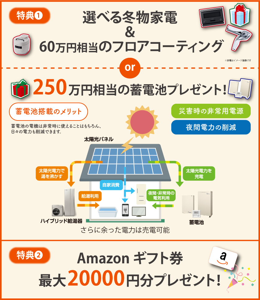 キャンペーン期間中、対象物件をご成約いただいた方に 選べる家電と、床を傷や汚れから守るフロアコーティングプレゼント。または、250万円相当の蓄電池をプレゼント。さらに、Amazonギフト券20,000円分もプレゼントいたします。