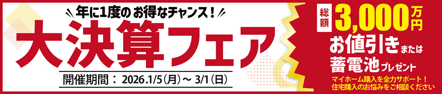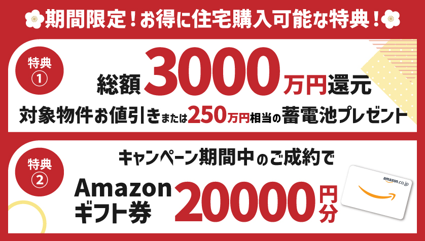 フェア期間中、対象物件をご成約いただいた方に 総額3000万円の中から、お値引きまたは蓄電池のプレゼント。さらにAmazonギフト券もプレゼントいたします。