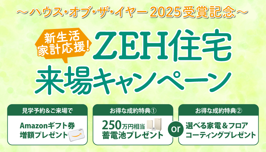 物価やエネルギー価格の継続的な高騰が、家計への大きな懸念となっています。住まいに求められる役割が変わりつつある今、セイズは業界最高峰の省エネ住宅評価制度である「ハウス・オブ・ザ・イヤー2025」で特別優秀賞を受賞しました。この受賞を記念し、「新生活・家計応援!ZEH住宅来場キャンペーン」を開催いたします。