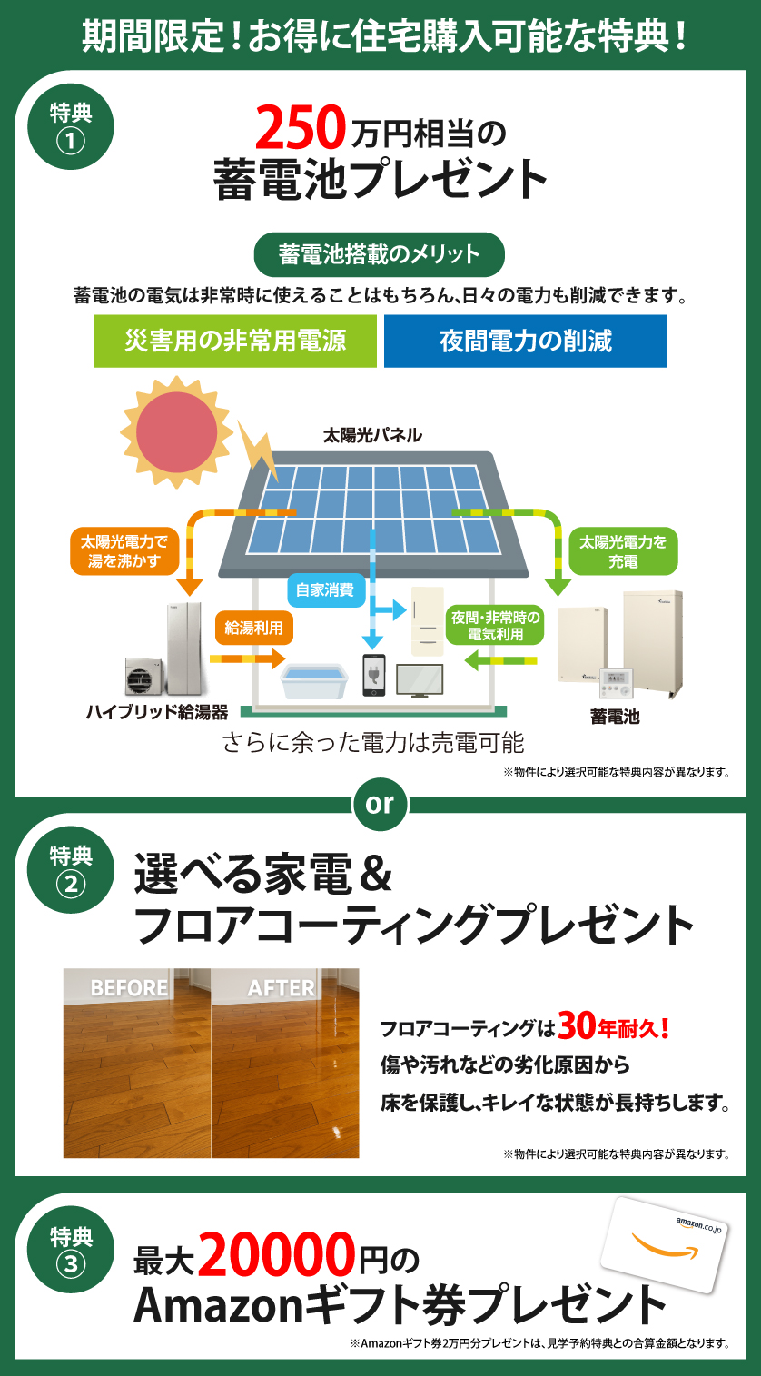キャンペーン期間中、対象物件をご成約いただいた方に 250万円相当の「蓄電池」プレゼント、選べる最新家電、フロアコーティング、さらにAmazonギフト券15,000円分(来場特典と合わせ計2万円分)をご用意しています。