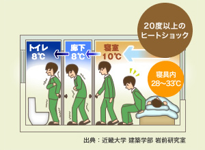 すぐれた保温性能と冷暖房の併用によって室内温度を効率よくコントロール。上下温度差・部屋間温度差の少ない快適な居住環境をつくることで、高齢者の家庭内死亡事故の原因につながるヒートショックの防止にも役立ちます。