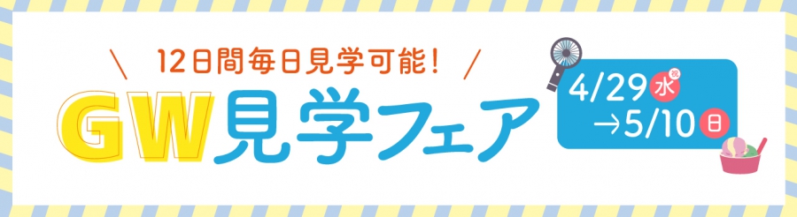 また、期間中毎日完成物件をご見学いただける「GW見学フェア」も開催しますので、是非この機会にお気軽にお問い合わせください。