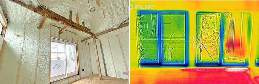 高断熱材・硬質ウレタンフォームで建物全体を包み込み、気密施工することで、魔法瓶のように保温性に優れた高気密・高断熱の住まいを実現。外気の影響を受けにくいため、一年中快適な室内温度を保ち、冷暖房のコストも抑えます。