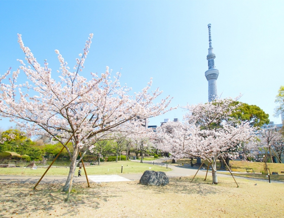 →吾妻橋から桜橋までの隅田川沿い約1㎞に広がる大型公園。春には桜並木の名所、夏は隅田川花火大会のスポットとしても有名です。