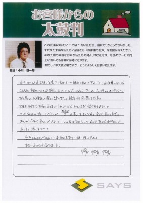 わがままなお願いにも「大丈夫です」と言って頂き、皆さんには本当に感謝しています。安心してお任せできました。この家を大切にしていきますので、これからもよろしくお願いします!