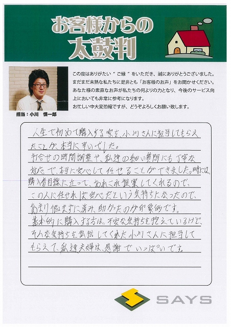 セイズで購入した理由は大澤さんの熱意です。 自信を持って説明する姿に心を動かされました! ここからが本当のお付き合いのスタートとのことなので しっかりとメンテナンスして長く住んでいけたらと思います。