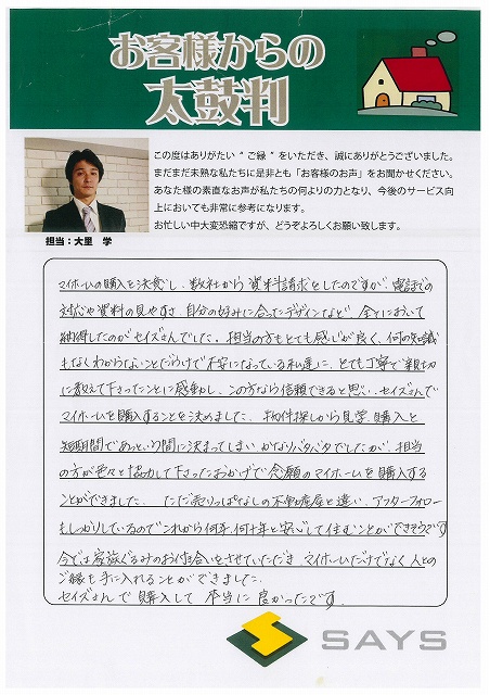 セイズで購入した理由は大澤さんの熱意です。 自信を持って説明する姿に心を動かされました! ここからが本当のお付き合いのスタートとのことなので しっかりとメンテナンスして長く住んでいけたらと思います。