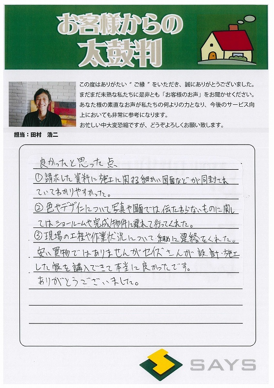 セイズで購入した理由は大澤さんの熱意です。 自信を持って説明する姿に心を動かされました! ここからが本当のお付き合いのスタートとのことなので しっかりとメンテナンスして長く住んでいけたらと思います。