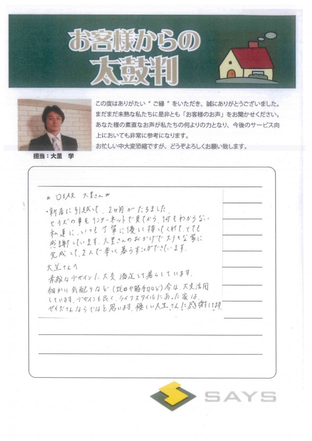セイズで購入した理由は大澤さんの熱意です。 自信を持って説明する姿に心を動かされました! ここからが本当のお付き合いのスタートとのことなので しっかりとメンテナンスして長く住んでいけたらと思います。