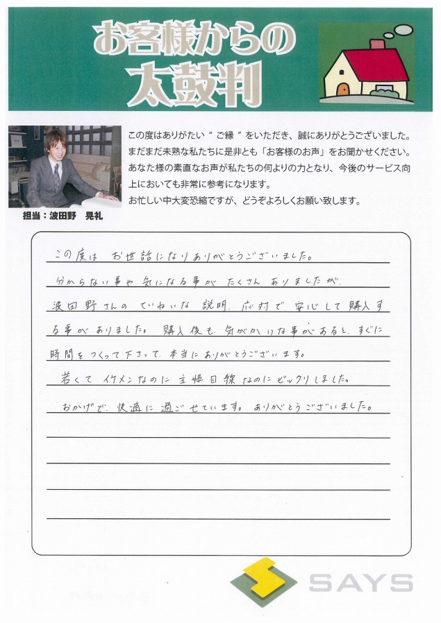セイズで購入した理由は大澤さんの熱意です。 自信を持って説明する姿に心を動かされました! ここからが本当のお付き合いのスタートとのことなので しっかりとメンテナンスして長く住んでいけたらと思います。