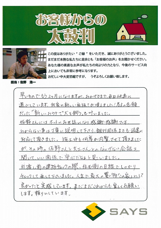 住んでみて改めてこの家を選んでよかったと思っています。担当の佐野さんには親切・丁寧に対応していただき、すごく安心して任せることができました。今後とも宜しくお願いいたします。