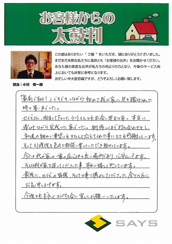 以前にセイズで建築した兄夫婦から佐野さんのことはよく聞いておりました。少しでも私たちの要望に応えようとして下さった姿勢には本当に感謝しています。お蔭様で思った以上のマイホームが完成しました!