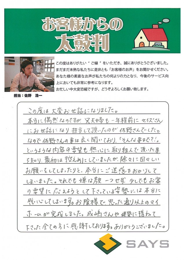 一生に一度の大きな買い物をお願いするにあたり、永くお付き合いできる会社を条件にピタッと来たのがセイズでした。私たち家族の想いを具現化してくださった皆さんに感謝しています!