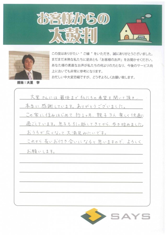 住んでみて改めてこの家を選んでよかったと思っています。担当の佐野さんには親切・丁寧に対応していただき、すごく安心して任せることができました。今後とも宜しくお願いいたします。