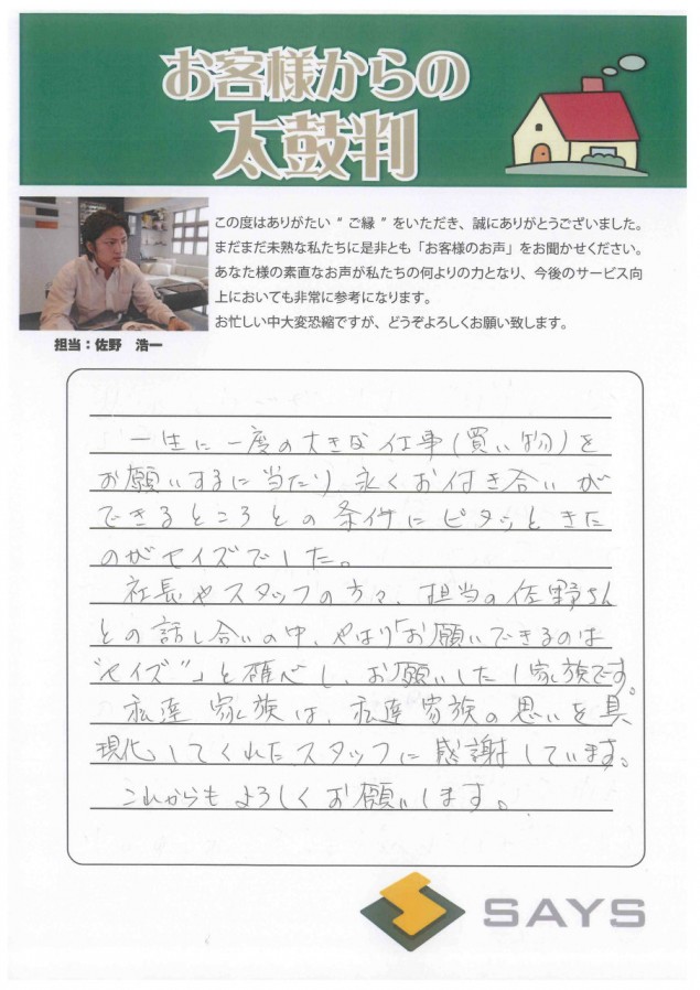 セイズで購入した理由は大澤さんの熱意です。 自信を持って説明する姿に心を動かされました! ここからが本当のお付き合いのスタートとのことなので しっかりとメンテナンスして長く住んでいけたらと思います。