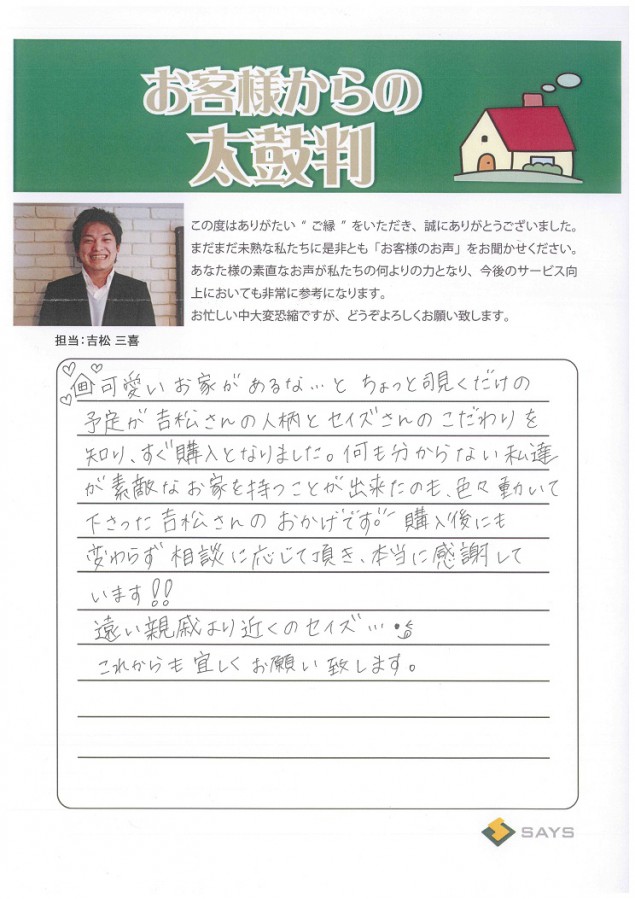 セイズで購入した理由は大澤さんの熱意です。 自信を持って説明する姿に心を動かされました! ここからが本当のお付き合いのスタートとのことなので しっかりとメンテナンスして長く住んでいけたらと思います。