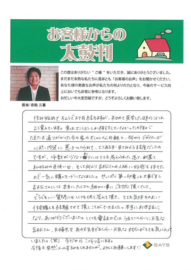 セイズで購入した理由は大澤さんの熱意です。 自信を持って説明する姿に心を動かされました! ここからが本当のお付き合いのスタートとのことなので しっかりとメンテナンスして長く住んでいけたらと思います。