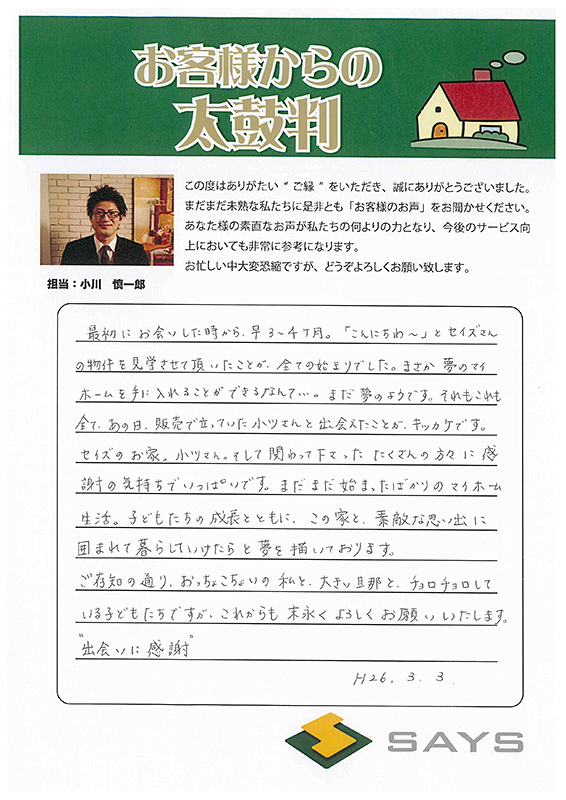 セイズで購入した理由は大澤さんの熱意です。 自信を持って説明する姿に心を動かされました! ここからが本当のお付き合いのスタートとのことなので しっかりとメンテナンスして長く住んでいけたらと思います。