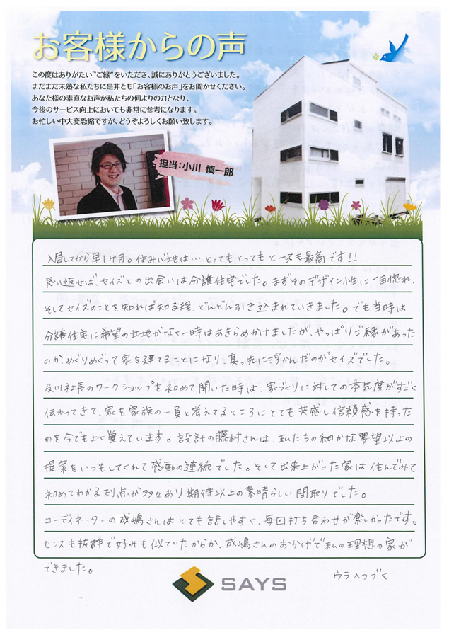 一生に一度の大きな買い物をお願いするにあたり、永くお付き合いできる会社を条件にピタッと来たのがセイズでした。私たち家族の想いを具現化してくださった皆さんに感謝しています!