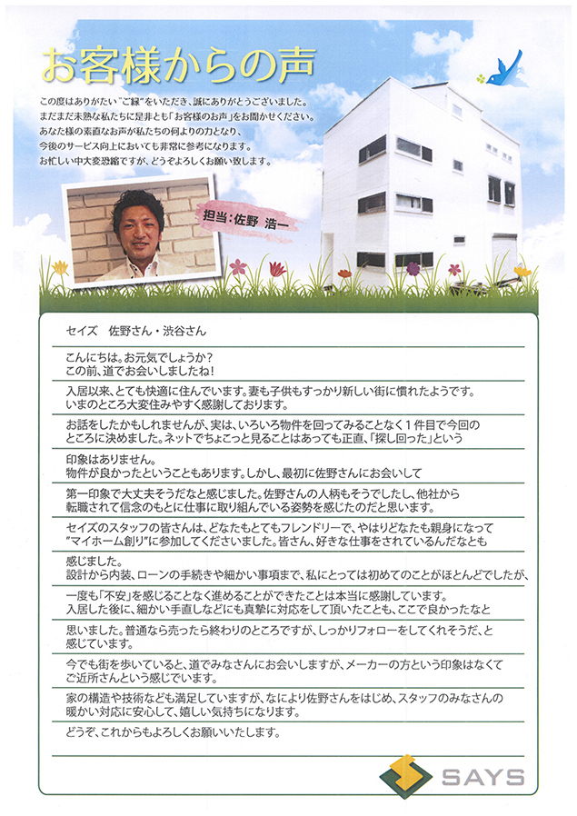 住んでみて改めてこの家を選んでよかったと思っています。担当の佐野さんには親切・丁寧に対応していただき、すごく安心して任せることができました。今後とも宜しくお願いいたします。