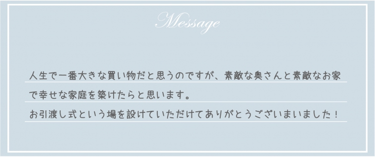 ご案内からご成約、ご成約からお打合せお引渡しと長い時間を一緒に過ごさせていただき、時にはご迷惑をお掛けしてしまうこともあったのですが、私の結婚式のお祝いをしていただいたり家庭のお話しを聞いていただいたりとお客様なのですがY様だからこそ築けた関係なのかなと感じております。