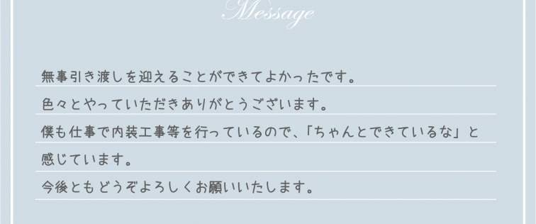 無事に引渡しを迎えることができてよかったです。同業者ということもあり清家さんはやりにくかったかと思いますが、丁寧に説明、対応していただいて非常に感謝しております。