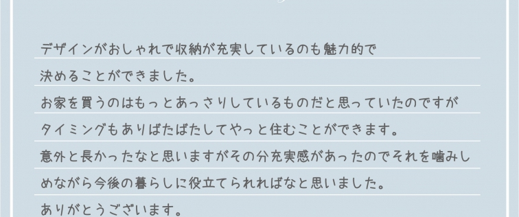内覧に行ったときにこれまで見てきた中でデザインも性能も1番良く、すぐに購入を決めました。ようやくマイホームに住めることにワクワクしています!今後ともよろしくお願いいたします。