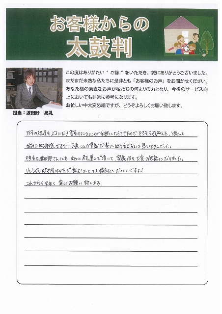 住んでみて改めてこの家を選んでよかったと思っています。担当の佐野さんには親切・丁寧に対応していただき、すごく安心して任せることができました。今後とも宜しくお願いいたします。