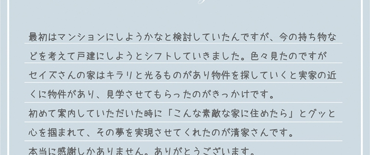 一生に一度の大きな買い物をお願いするにあたり、永くお付き合いできる会社を条件にピタッと来たのがセイズでした。私たち家族の想いを具現化してくださった皆さんに感謝しています!
