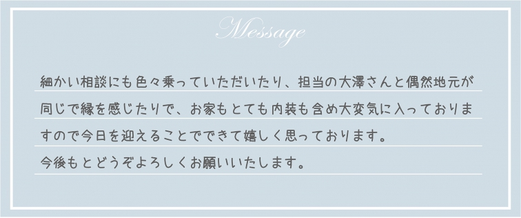 様々なご縁があり、 夢だと思っていた戸建てに住むことができてとても嬉しく思います。 高性能住宅なので、教えていただいたメンテナンスをきちんとおこなって、長く住んでいけたらと思います。
