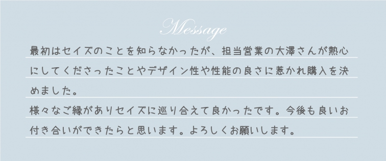 旦那様には営業としてではなく、個人として私を尊重してくださり、たくさん質問をして頂き、私自身も成長ができました。