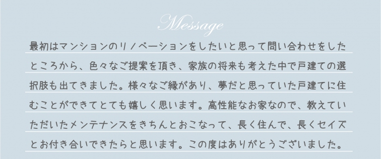 一生に一度の大きな買い物をお願いするにあたり、永くお付き合いできる会社を条件にピタッと来たのがセイズでした。私たち家族の想いを具現化してくださった皆さんに感謝しています!