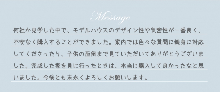 内覧に行ったときにこれまで見てきた中でデザインも性能も1番良く、すぐに購入を決めました。ようやくマイホームに住めることにワクワクしています!今後ともよろしくお願いいたします。