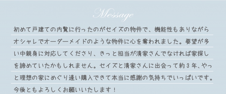 一生に一度の大きな買い物をお願いするにあたり、永くお付き合いできる会社を条件にピタッと来たのがセイズでした。私たち家族の想いを具現化してくださった皆さんに感謝しています!