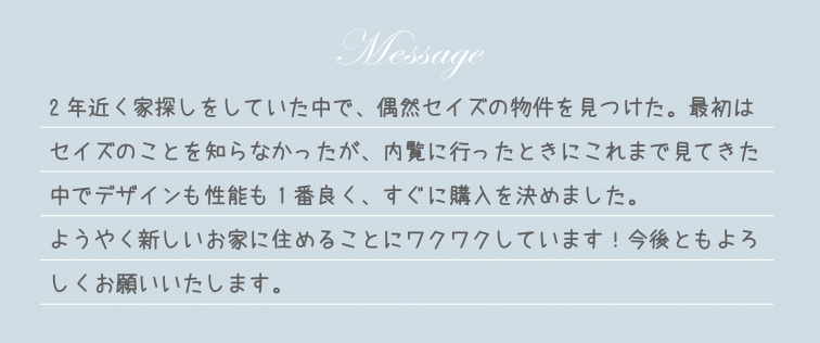 一生に一度の大きな買い物をお願いするにあたり、永くお付き合いできる会社を条件にピタッと来たのがセイズでした。私たち家族の想いを具現化してくださった皆さんに感謝しています!