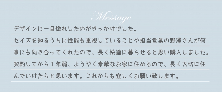 一生に一度の大きな買い物をお願いするにあたり、永くお付き合いできる会社を条件にピタッと来たのがセイズでした。私たち家族の想いを具現化してくださった皆さんに感謝しています!