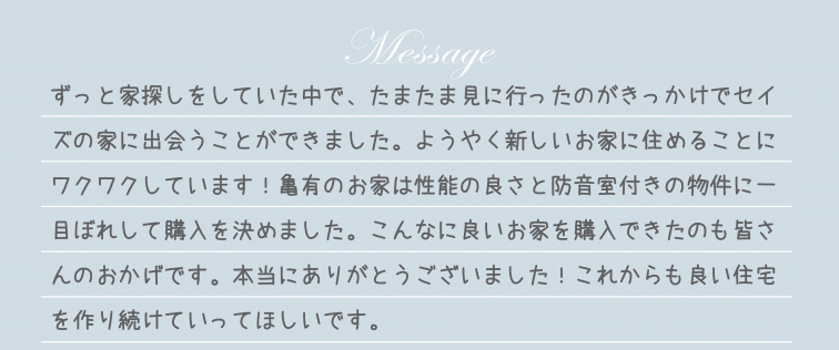 一生に一度の大きな買い物をお願いするにあたり、永くお付き合いできる会社を条件にピタッと来たのがセイズでした。私たち家族の想いを具現化してくださった皆さんに感謝しています!