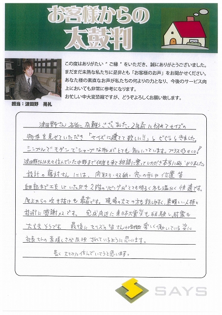 以前にセイズで建築した兄夫婦から佐野さんのことはよく聞いておりました。少しでも私たちの要望に応えようとして下さった姿勢には本当に感謝しています。お蔭様で思った以上のマイホームが完成しました!