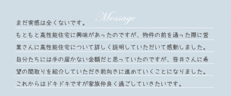 様々なご縁があり、 夢だと思っていた戸建てに住むことができてとても嬉しく思います。 高性能住宅なので、教えていただいたメンテナンスをきちんとおこなって、長く住んでいけたらと思います。