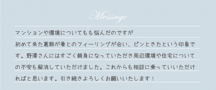 野澤さんに出会っていなければ、今の物件を買うという選択肢はなかったと思います。私たちのことを第一に考えて対応してくださるので、戸建を買うなら野澤さんにお願いしようと決めていました。