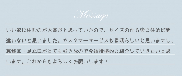 一生に一度の大きな買い物をお願いするにあたり、永くお付き合いできる会社を条件にピタッと来たのがセイズでした。私たち家族の想いを具現化してくださった皆さんに感謝しています!